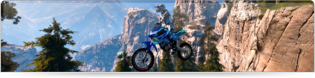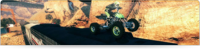 Si les tracés sont torturés, le gameplay ne s’encombre pas de subtilités à maîtriser. La notion de pilotage est toute relative et, parfois, on s’imagine plus aux commandes d’un vaisseau sorti de wipe-out qu’au guidon d’un quad qui résiste à des chutes de plusieurs centaines de mètres. Ce constat se renforce au fil des courses où vous enchaînez des moments de pure cascade avec des séquences de pilotage la tête en bas ! L’impression de vitesse est d’ailleurs accentuée par une déformation sans doute trop exagérée de votre champ de vision, et cet effet « fuyant » se révèle un peu fatigant à la longue. Tout va très très vite et, si c’est finalement une bonne nouvelle de conduire un engin aussi maniable, en contre partie cela bride aussi votre courbe de progression dans le jeu. Ne cherchez pas de différence entre les surfaces des quatre environnements disponibles (Arizona, Parc Yosemite, Andes, Grèce) durant le mode histoire, elles sont trop minimes pour avoir un réel impact sur votre conduite. Que vous soyez sur la boue, la neige ou la terre aride, vous foncerez comme un malade. La gestion des trajectoires de votre missile (pardon, quad) est donc un aspect déterminant du jeu pour terminer dans les trois premiers. Pas de dérapage, pas de gestion du poids du corps du pilote, rien que de la vitesse pour un gameplay ultra arcade assumé.