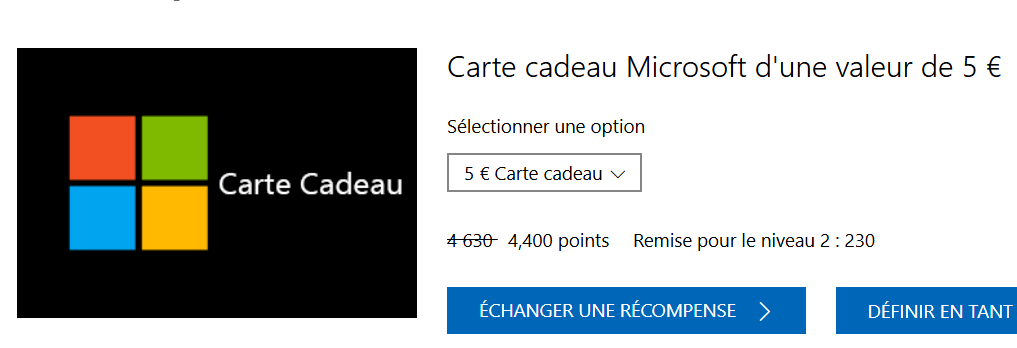 En vous rendant sur cette page, les niveaux 2 du programme peuvent récupérer des cartes cadeaux Xbox de 5 euros en échange de 4 645 points, soit une économie de 10%. Les plus futés se tourneront vers les cartes cadeaux Microsoft, qui sont encore plus avantageuses et s’utilisent exactement de la même manière (4 400 points pour 5€).