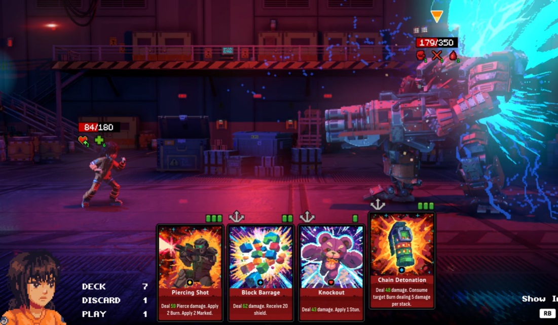 Pour cela, Sister M peut se déplacer librement, et interagir avec quelques éléments du décor, comme pour ramasser un objet important ou choisir l’étage de l’ascenseur. Mais concrètement, notre prise en main a surtout servi à mettre le doigt sur le système de combat du jeu, finalement bien différent de ce que nous avions vu dans Echo Generation. Cette suite troque le tour par tour classique pour un «deckbuilding RPG». Autrement dit, chaque attaque est conditionnée par les cartes que vous avez choisi d’embarquer avec vous, avec une part de hasard qui en sélectionne un maximum de cinq à chaque tour. Sister M démarre avec trois cartes seulement, mais en quelques minutes nous en avions une bonne quinzaine à force d’en ramasser en explorant le décor, en plus d’en récupérer auprès des ennemis éliminés.