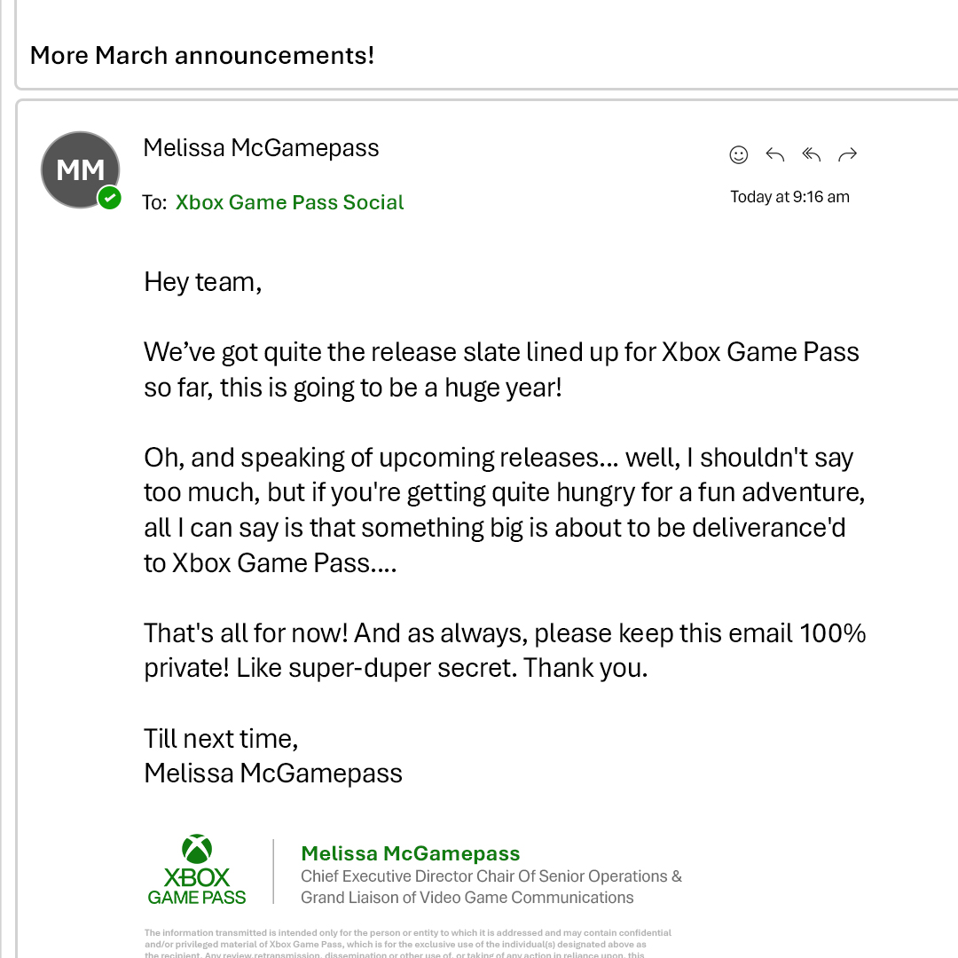 Dans un mail parodique envoyé par Melissa McGamePass, et partagé hier soir par plusieurs comptes officiels, l’employée fictive affirme que l’année 2026 sera énorme et que ceux qui ont soif d’aventure auront de quoi faire en mars. Un message qui laisse un autre indice, pointant effectivement vers très gros morceau puisque le titre concerné a été nommé dans la catégorie du meilleur jeu de l’année aux Game Awards 2025.