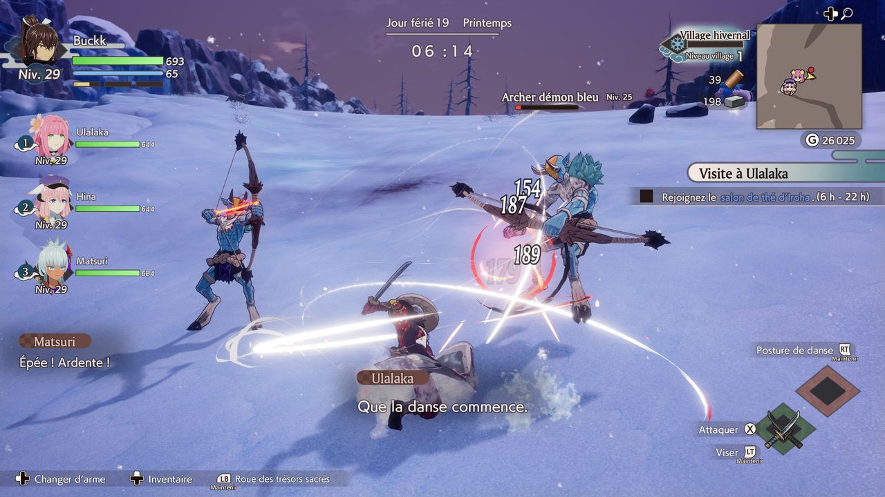 Un scénario léger, mais qui suffit à justifier la découverte d’un monde divisé en plusieurs petites zones plus ou moins ouvertes. Si le scénario se veut linéaire, Rune Factory: Guardians of Azuma laisse ainsi la possibilité au joueur de se promener et de se téléporter où bon lui semble à partir du moment où on a débloqué un lieu. La petite subtilité, si on le compare à d’autres titres du même genre, est que le changement de saison dans le calendrier (sur le base de 30 jours par saison) n’a pas énormément d’influence sur les environnements visités. Ici, chaque village est associé à une saison, ce qui permet néanmoins de bénéficier d’un terrain de jeu plus grand qu’à l’accoutumée avec quatre zones au lieu d’une. Libre à vous ensuite de passer plus de temps dans un lieu ou dans un autre, en fonction de vos envies.